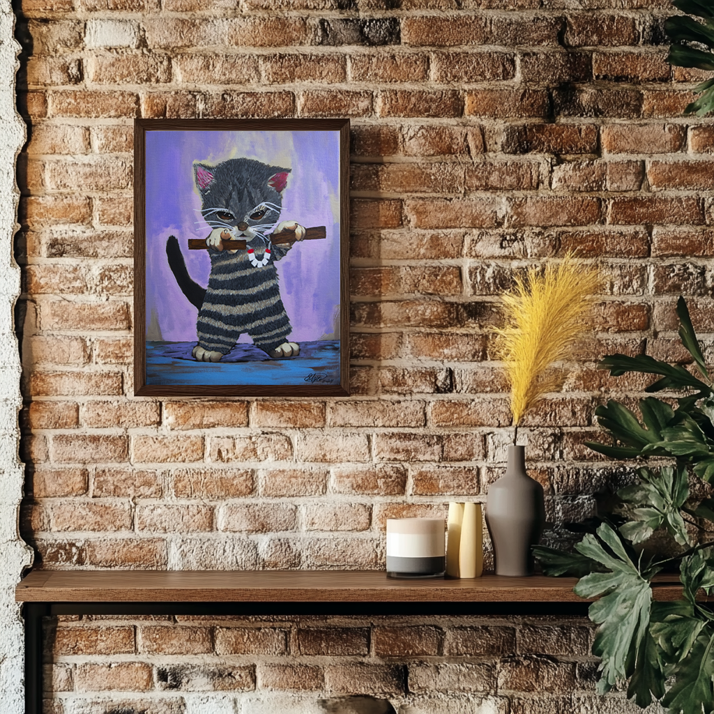 The latest in my Murder Kitten series was a commission for a little girl that was a huge Taylor Swift fan. The father contacted me to paint a gray kitten with black stripes that was holding a pair of nun-chucks that the center chain was made of a Taylor Swift bracelet with her kitten's name. Obviously for the prints i edited out the kitten's name, but I can also add your kittens name into the artwork if it is 5 letters or less.